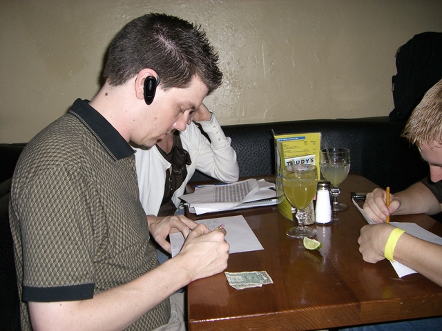 tallying the results. One of the missions was to present the I.D for the youngest person. We found a *13*-year old, but he refused it because the ID didn't show the age. That wasn't in the rules. Suck. The $1 on the table is my bribe for him to reconsider what I think was his faulty judging. He didn't. But he kept the dollar. Hey! |